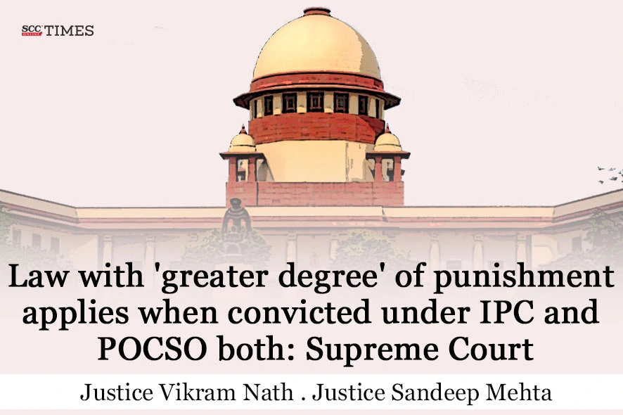 Supreme Court: In an appeal filed by the convict against the judgment passed by the Allahabad High Court, wherein the Court affirmed the conviction order of the Trial Court, for the offences punishable under Sections 376(2)(f) and 376(2)(i) of the Penal Code, 1860 and Sections 3 read with Section 4 of Protection of Children from Sexual Offences Act, 2012, (‘POCSO Act’) the division bench of Vikram Nath and Sandeep Mehta* , JJ. clarified that when the alleged acts or omissions constitute offence both under the IPC and the POCSO Act then, the law which prescribes the punishment of greater degree would have to be applied. Hence, it viewed that conviction for the offences punishable under Sections 376(2)(f) and 376(2)(i) of IPC and Section 3 read with Section 4 of POCSO Act was wholly justified. However, the High Court erred while directing that the convict would have to serve life imprisonment for remainder of his natural life as provided under Sections 376(2)(f) and 376(2)(i) of IPC.